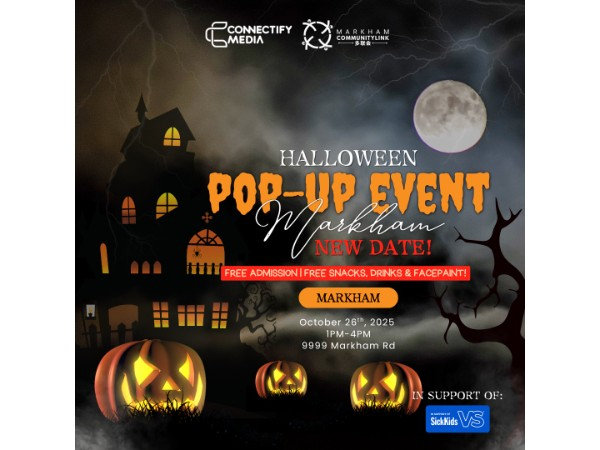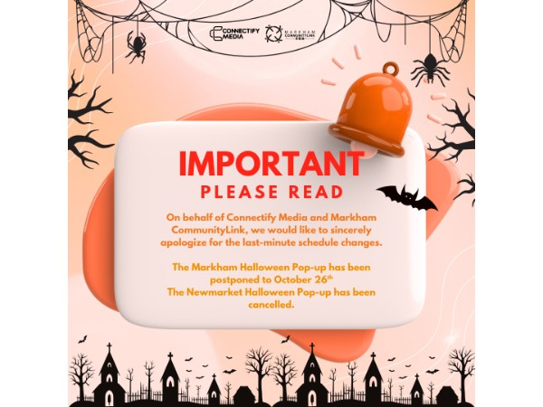 🎃| Markham CommunityLink and Connectify Media are excited to present our 3rd Annual Halloween Pop-Up Event! This year, we’re bringing the fun to Markham! Free admission, complimentary drinks, snacks, and face painting!