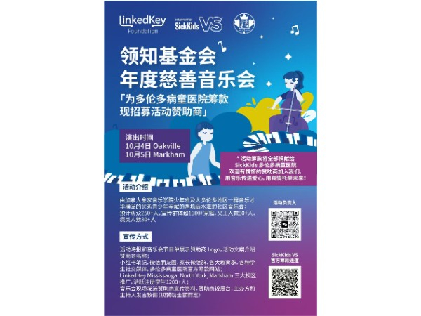 为多伦多病童医院筹款的【 LinkedKey Foundation 年度慈善音乐会】将于10月4日和5日在Oakville 和 Markham 举行,加拿大皇家音乐学院少年班及大多伦多地区一群音乐才华横溢的优秀青少年将奉献两场高水准的社区音乐会。